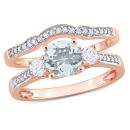 Celebrate your love story with the exquisite Women's 1/8 CT Diamond and 7/8 CT TGW Aquamarine Bridal Set in beautiful 10k Rose Gold. This stunning 2-piece set embodies elegance and sophistication, making it the perfect symbol of your everlasting bond. At the heart of this enchanting bridal set are the mesmerizing aquamarine gemstones. Known as the gemstone of serenity and tranquility, aquamarine exudes a captivating pale blue hue that mirrors the calmness of the ocean. The delicate color is complemented by the brilliance of the 1/8 CT diamond accents, creating a breathtaking contrast that catches the light with every movement.The engagement ring features a timeless 3-stone design, symbolizing the past, present, and future of your love. The enchanting aquamarine center stone is flanked by two sparkling diamonds, emphasizing the significance of your shared journey. The curved wedding band perfectly fits alongside the engagement ring, creating a seamless and harmonious union.