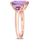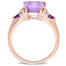 Demonstrate your affection with this warm hued Rose de France Amethyst and Diamond Accent 3-Stone Cocktail ring. Crafted in radiant rose plated sterling silver, it features an octagon-cut multi-prong-set rose de France gemstone (10 x 8mm) at the center flanked by two trilliant-cut, prong-set amethyst gemstones (3 x 3mm) it features eight round-cut, prong-set diamond accents (G-H, I2-I3). Enhanced with a high polish finish, this gorgeous cocktail ring is perfect for a bride-to-be. Melt her heart with this glamourous 3-stone ring.