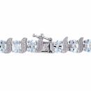 This lovely tennis bracelet features oval-cut aquamarine stones enhanced with round white diamonds set in sterling silver. This gorgeous piece is secured with a box-with-tongue clasp.