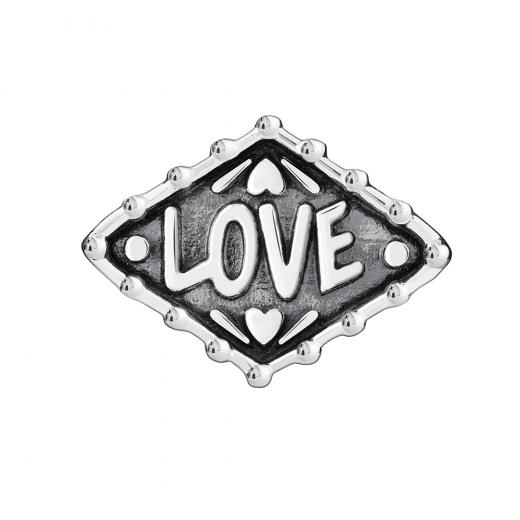 Designed in sterling silver, the diamond-shaped design is highlighted with an oxidized finish and showcases love on both sides. Beaded detail accents the outer rim of the charm for added interest.