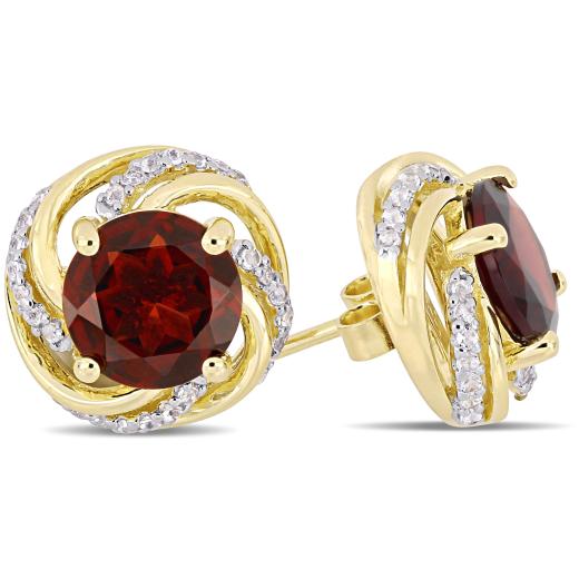 These trendsetting gemstone swirl stud earrings are crafted in yellow plated sterling silver and feature two round-cut, prong-set twinkling garnets at the centre with 56 round-cut, buttercup-set sparkling white topaz stones set together in a stunning swirl motif, perfect for all occasions. These gorgeous earrings are a perfect versatile addition to any ensemble, from business casual to formal wear. Choose these earrings as a lovely choice either for yourself or someone you love. A wonderful choice for that special January birthday in your life.