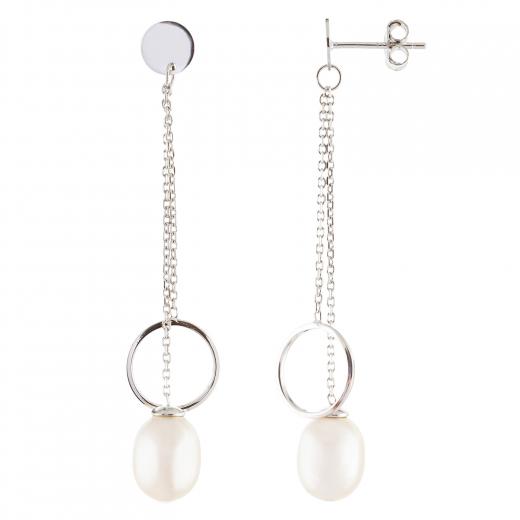 A pair of white dangling freshwater pearl double dangling chain earrings in sterling silver rhodium plated