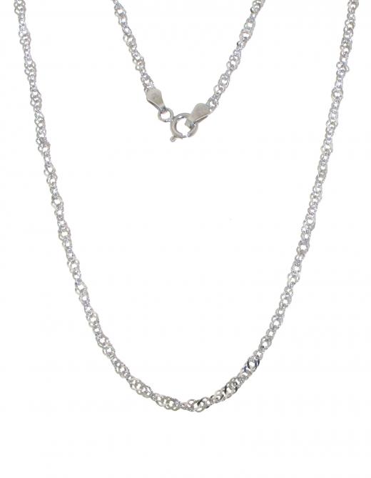 This chain features a graceful Singapore link design, characterized by interlocking twisted links that create a fluid and elegant texture. The slender 2.1mm width adds a touch of understated glamour, making it a versatile accessory suitable for various occasions. The lustrous sterling silver construction enhances the chain's enduring beauty, offering a perfect blend of classic charm and modern elegance.