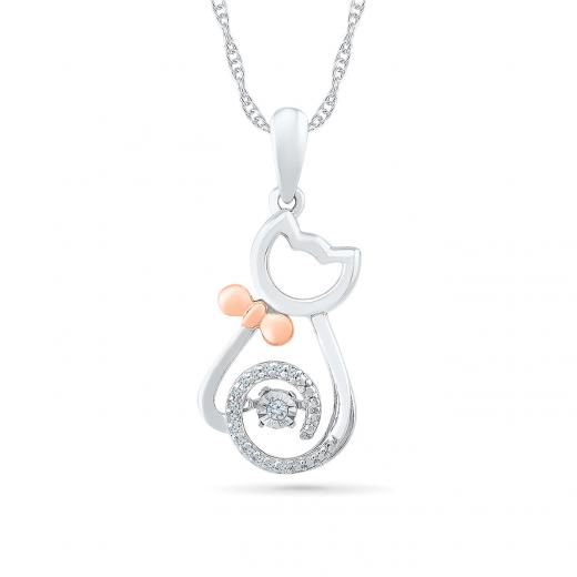 This adorable Dancing Diamond Cat pendant is a cute choice for the cat lover in your life. Crafted in sterling silver and embellished with a 10kt rose gold bow tie, the cat's tummy hosts a darling Dancing Diamond and the curl of the tail has even more tiny diamonds. The pendant gracefully sways from an 18" rope chain. The perceptual motion of Dancing Diamonds waltz to the beat of your heart.