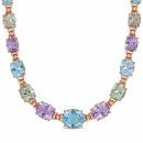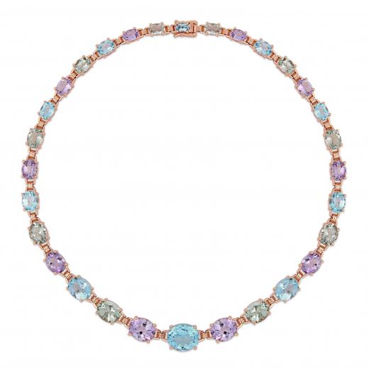 This bold multi-gemstone link necklace is crafted in rose plated sterling silver and showcases a total of 30 oval-cut, prong-set green amethyst, sky-blue topaz and Rose de France gemstones placed together in a ravishing link design. Instantly elevate any ensemble with this colourful and shimmering gemstone necklace. A perfect choice for today's contemporary woman with a unique and trendsetting sense of style. Choose this exquisite piece either for yourself or someone you love.