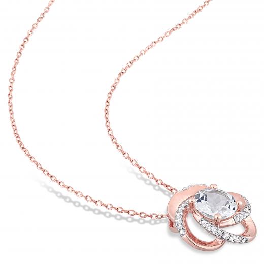 This swirl halo gemstone necklace is set in rose plated sterling silver and features a white topaz stone at the centre of its 33 white topaz studded swirl halo design. This necklace is sure to add a touch of elegance and colour to any ensemble.
