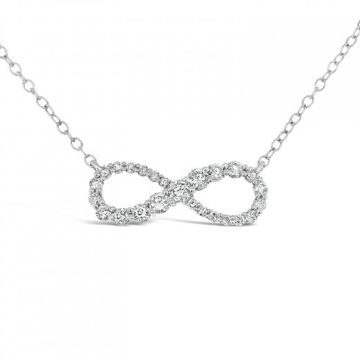 Celebrate eternal beauty with this 10K white gold infinity necklace, gracefully adorned with 0.33 carats of shimmering diamonds. Symbolizing endless love and timeless style, this exquisite piece is perfect for marking life’s most precious moments.