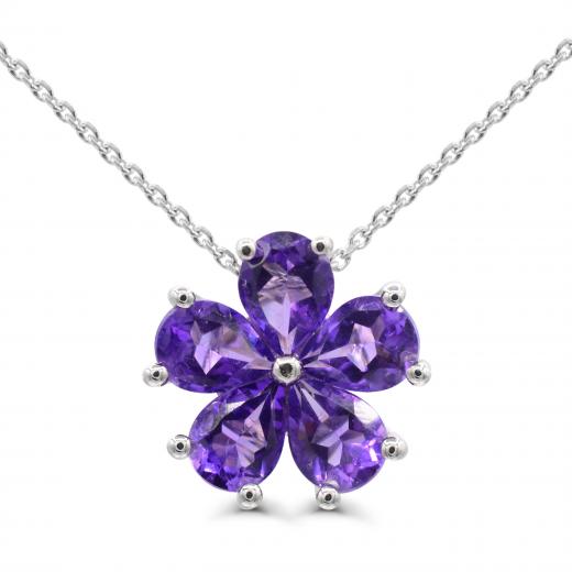 This wonderful floral pendant is crafted in sterling silver. This lovely necklace features pear-cut amethyst gemstones clustered together to form a flower. Enhanced with a high polish finish, this stunning pendant is hung on an 18-inch cable chain and is secured with a spring ring clasp. This necklace is the perfect and timeless addition to any jewellery collection and makes a great gift for your special someone.