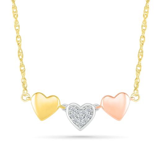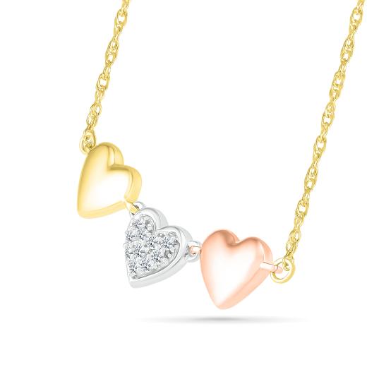 The exquisite 10K Tri-Colour Gold Heart Trio Diamond Necklace is a stunning symbol of love and style. Crafted with precision and elegance, this necklace showcases a captivating design that will leave you breathless.