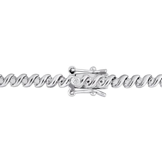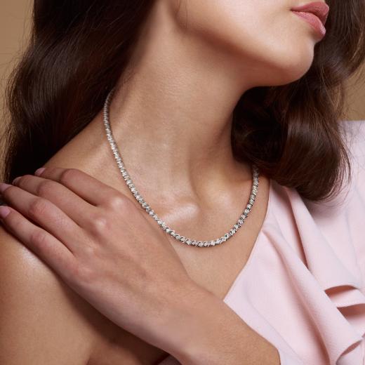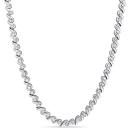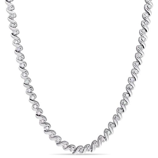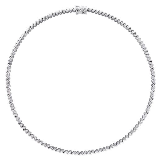 Add elegance and charm to your look with this diamond tennis necklace crafted in lustrous sterling silver. This shimmering necklace features 70 stunning diamonds (H-I, I3) in a two-prong setting. It is 17 inches long and has a high-polish finish. A classic piece of jewellery, this diamond tennis necklace is perfect for any occasion.
