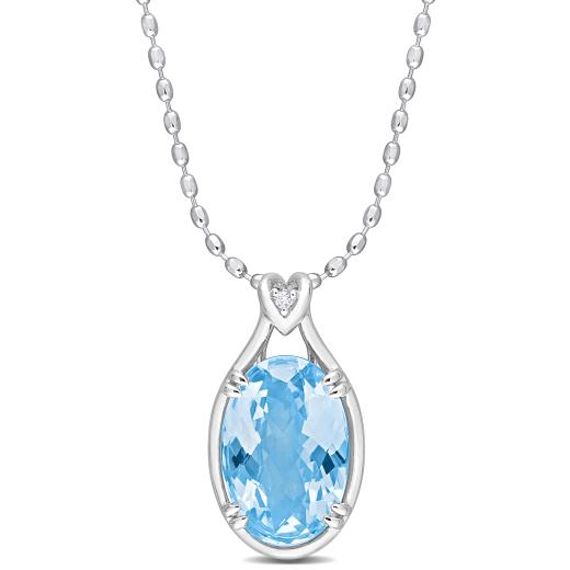This eye-catching oval solitaire pendant with a chain is crafted in lustrous sterling silver and features an oval checkerboard-cut, prong-set sky blue topaz (18x12mm) adorned with a round-cut, prong-set white topaz (1.8x1.8mm) gemstone at the stalk of the pendant. Enhanced with a polished finish, this splendid pendant is suspended on an 18-inch cable chain secured with a spring-ring clasp. This shimmering necklace will make an elegant addition to any jewellery collection.