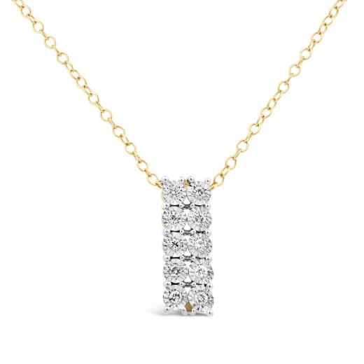 Elevate your style with a touch of modern sophistication through our 10K Yellow Gold Double Bar Diamond Pendant, featuring a dazzling 0.10 carat total weight of diamonds. This pendant boasts a sleek and contemporary design with two parallel bars adorned with brilliant diamonds. The warm radiance of yellow gold, complemented by the bright gleam of white gold around the diamond settings, adds a level of sophistication to this piece. Versatile and chic, this pendant is the perfect accessory to enhance your look for any occasion.