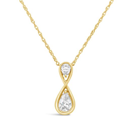 Elegant and meaningful, this New Brilliance pendant showcases a modern infinity silhouette set with two pear‑shaped lab grown diamonds totaling 0.53 CTW. One pear diamond sits at the top of the design while the other forms the lower curve, creating a balanced, graceful flow within the polished 10K yellow gold frame. The teardrop contours echo the infinity symbol’s continuous shape, adding brilliance and symbolism to the piece.