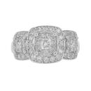 This modern 14k white gold diamond ring charms with magnificent sparkle. Crafted with a three-stone clustered design, this 1ctw ring features a princess cut diamond at the centre of each cluster, with a squared double halo.