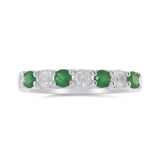 This charming ring features four round cut emeralds and three brilliant cut diamonds. This magnificent anniversary band is crafted in glittering 14k white gold and is sure to add a touch of elegance to your collection.