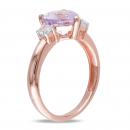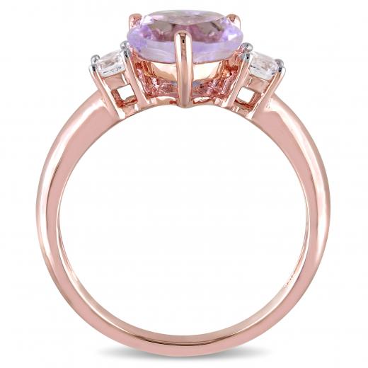This classic three-stone ring features a heart-cut rose de France center stone with two round created white sapphires. The ring is crafted in rose plated sterling silver with a highly polished finish.