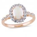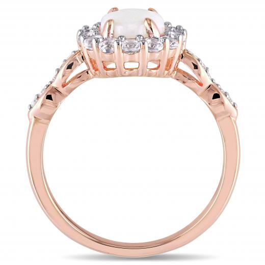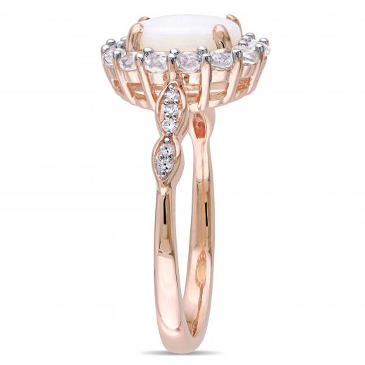 This lovely engagement ring is set in 14-karat rose gold and features an oval-shaped opal stone at its center with a halo of white topaz and diamond accents surrounding it. This ring is sure to add a touch of colour and elegance to any ensemble.