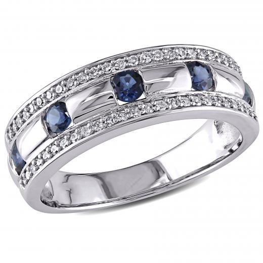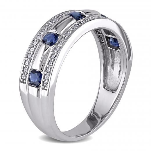 This dazzling men's ring features five round-cut sapphires enhanced by 50 round white diamond side stones set in 10-karat white gold. This gorgeous ring is enhanced with a high polish finish.