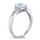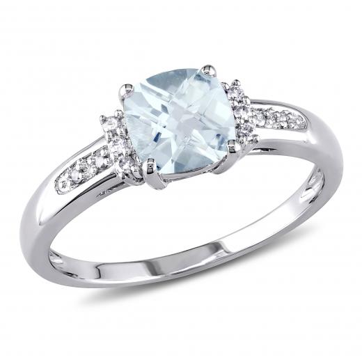 This delightful ring features a cushion-cut aquamarine center stone and round white diamond side stones set in 10-karat white gold. The lovely ring is enhanced with a high polish finish.