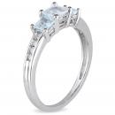 Let this Aquamarine and Diamond Three Stone Ring tell her your heart is hers. This ring features a square-cut (4mm) aquamarine in the center of this uniquely designed white gold ring and square-cut (3.5mm) aquamarine gemstones with 8 round-cut, channel-set diamond accents (G-H, I2-I3) shimmering along the band.