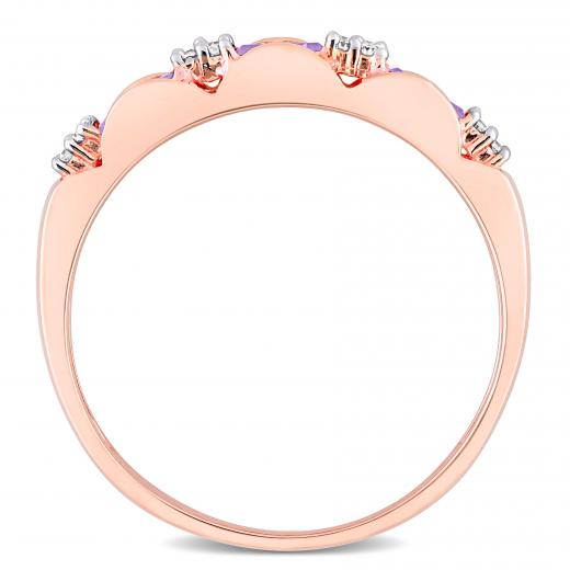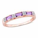 This fabulous stacking three-stone anniversary ring is crafted in 10-karat rose gold. This pretty wedding ring features alternating baguette-cut amethyst and round-cut white topaz gemstones. Enhanced with a high polish finish, this stackable eternity ring is the perfect addition to any jewellery collection. Whether worn as an anniversary band, wedding band or simply a gorgeous gemstone accessory, this ring is a great gift for a woman with a classic and trendy sense of style.