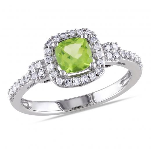 This classic ring features a cushion-cut peridot center stone with round diamonds set in 10-karat white gold. This ring glimmers with a high polished finish.