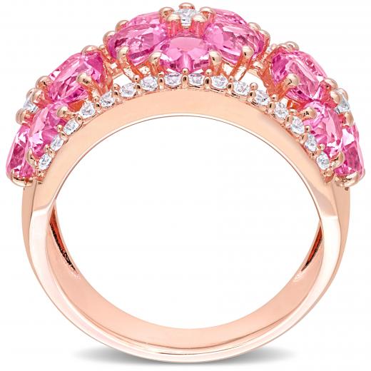This created sapphire floral cocktail ring is crafted in rose plated sterling silver. This modern ring features 15 heart-cut created pink sapphires along with 35 round-cut created white sapphires in a unique triple flower semi-eternity design. Instantly add a touch of color, elegance and class to any ensemble with this stunning gemstone ring. A perfect choice either for yourself or as a special gift for someone you love. This statement ring will make a standout addition to any jewelry collection.