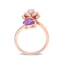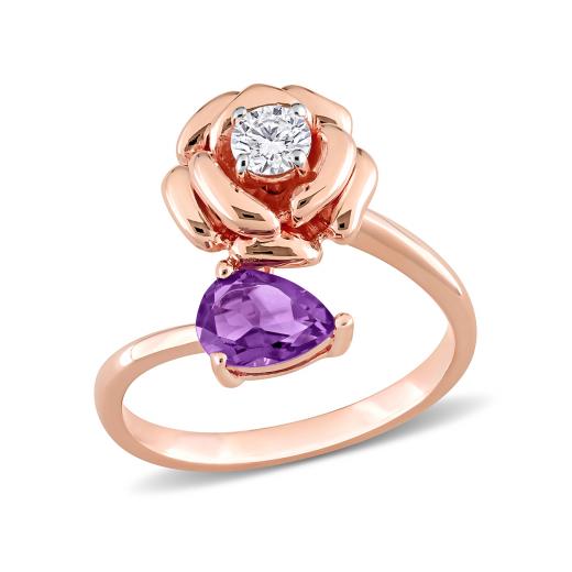Keep it uber stylish with this one-of-a-kind pear african amethyst white topaz rose ring. Crafted in lustrous rose plated sterling silver, this gorgeous ring showcases one pear-cut prong-set Africa amethyst at one end and a round prong-set white topaz gemstone studded in a delicate rose design at the other end of an adjustable wrap ring. Enhanced with a polished finish, this beautiful ring is an ideal gift for your lady love.