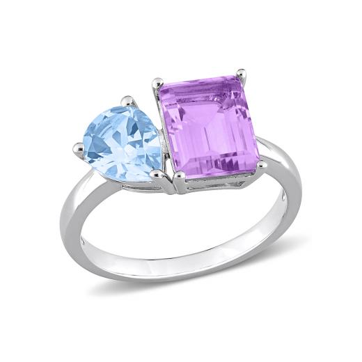 Accessorize boldly with this vibrant pear sky blue Topaz octagon pink amethyst 2-stone ring. Crafted in lustrous sterling silver, this ring showcases one pear-cut prong-set sky blue topaz and one octagon-cut prong-set pink amethyst gemstone studded elegantly on a sleek band. Enhanced with a brilliant finish, this beautiful ring is ideal for a flattering look.