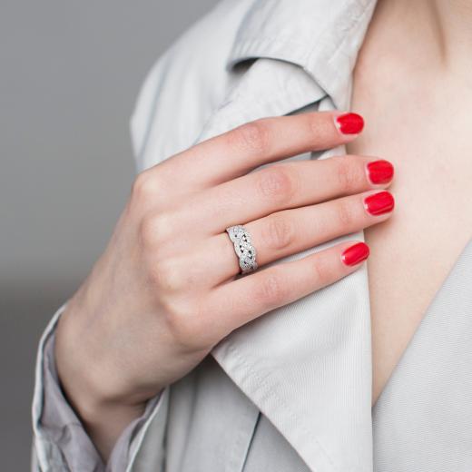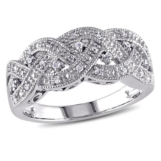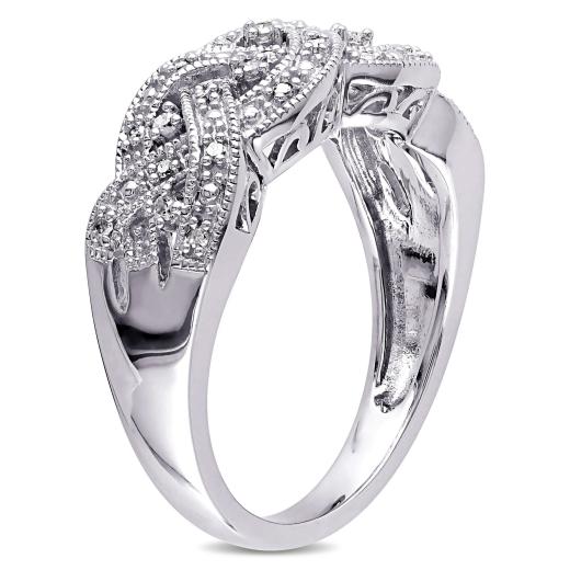 This stunning 1/8 CT TW Braided Diamond Ring in Sterling Silver, a symbol of sophistication and style. Crafted with meticulous attention to detail, this ring features a mesmerizing braided design that exudes elegance and charm. Each intricately woven strand showcases dazzling round-cut diamonds, totaling 1/8 carat in weight, adding a touch of brilliance and sparkle to the piece. Set against the backdrop of sterling silver, this ring radiates timeless beauty and versatility. Whether worn as a symbol of everlasting love or as a chic accessory for any occasion, this braided diamond ring is sure to capture hearts and turn heads. Elevate your jewelry collection with this exquisite piece that seamlessly blends classic sophistication with modern flair.