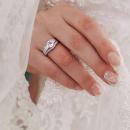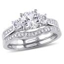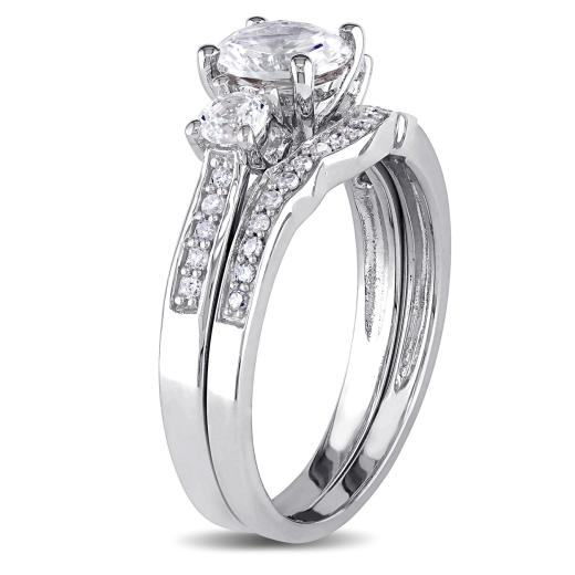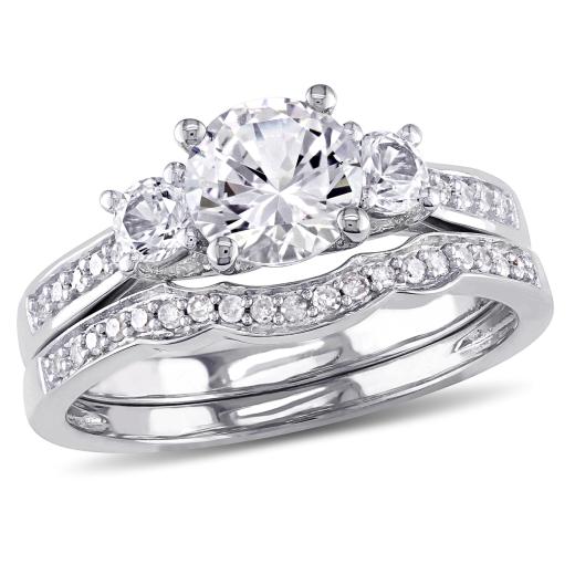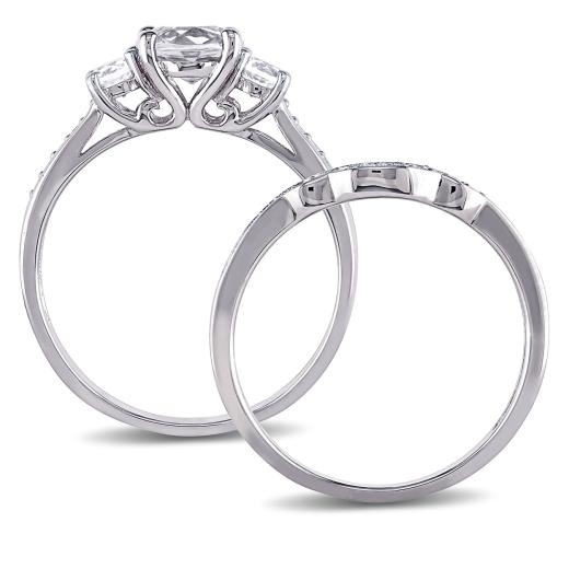 Celebrate your love with this exquisite 1/7 CT TW Diamond and Created White Sapphire 3-Stone Vintage Bridal Set. Crafted in 10k white gold, this set features a stunning trio of diamonds and white sapphires, surrounded by sparkling accents. The vintage-inspired design adds a timeless charm, making it the perfect symbol of your eternal commitment.