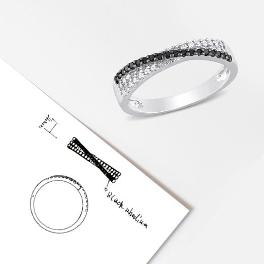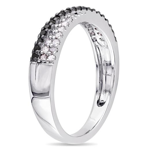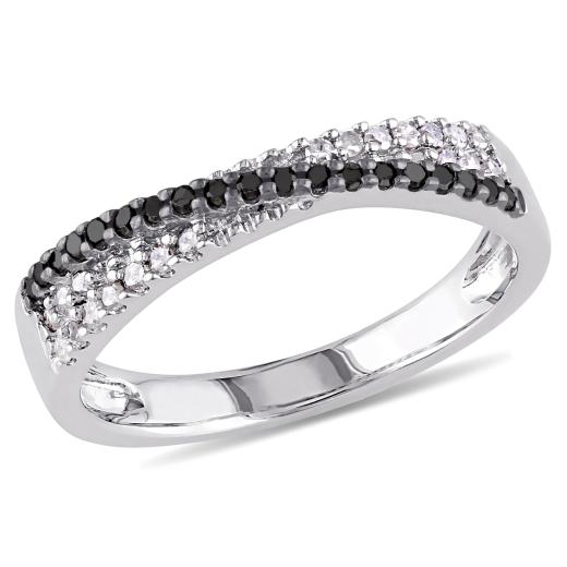 Simplistic design and modern style are the inspiration for this dual tone Black and White Diamond Fashion Ring. The 1/4 ct. T.W of black and white diamonds beautifully contrast each other. This Black and White Diamond Fashion Ring set in sterling silver, available in sizes 5-10, exudes sophistication day or night.