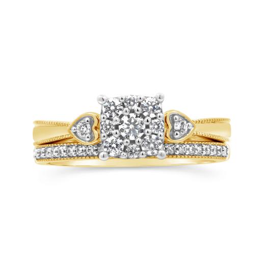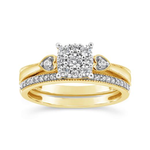 This elegant bridal set features a matching band and a center diamond cluster that sparkles brilliantly. Heart-shaped side accents add a romantic touch, while millgrain detailing lends vintage charm. Crafted in warm 10K yellow gold, it's a timeless symbol of love.